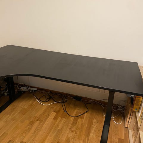 Ett stort fint skrivbord med linoleumsskiva. Det finns gott om plats för datorskärm, tangentbord och övriga tillbehör. Passar bra både i hemmet och på kontor.