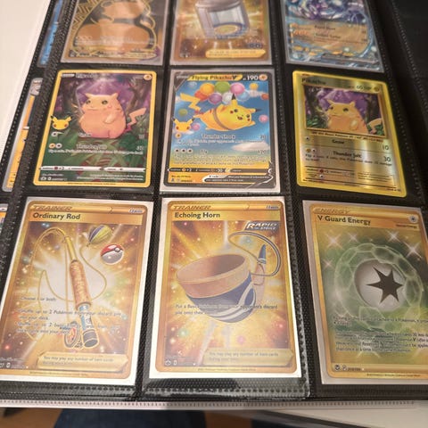 Replikor men fina Pokémon samling kort med flera holografiska och full art-kort i plastfickor. Blandade motiv från olika Pokémon och serier. Kortens exakta antal och set framgår inte av bilderna, men samlingen innehåller flera V- och EX-kort samt kort med foil-ytor. Passar för yngre samlare av Pokémonkort då flera av korten är replikor eller som utökning av en befintlig kortsamling.