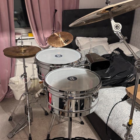 Perfect för nybörjare . Finns cymbal stativ och bass pedal som ingår samt hi hat stativ som saknar bara ( hi hat clutch )