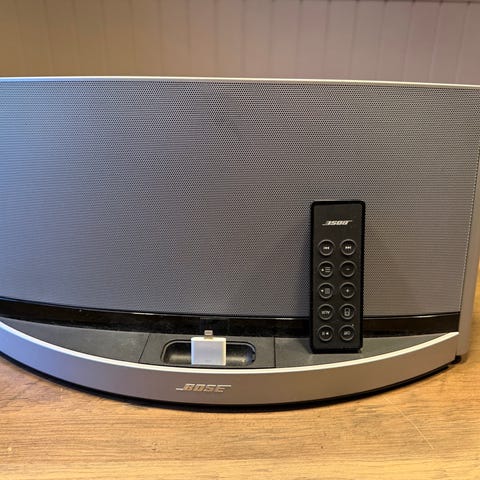 Bose högtalare med inbyggd dockningsstation för kompatibla enheter som Bluetooth adapter. Följer med en adapter men vet inte om den fungerar. Enheten är fristående och kan placeras på bord eller hylla. Passar för uppspelning av musik och ljud i hemmiljö. Silverfärgad front med integrerat högtalargaller och dockningsanslutning på framsidan.