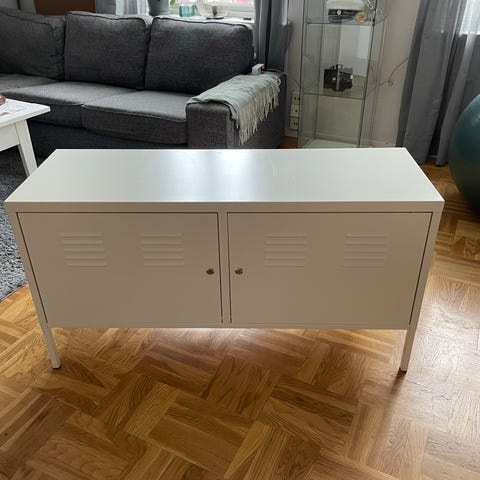 Vitt Ikea PS-skåp i metall. Repor och nån buckla, se bild. Hål på baksidan för att dra sladdar. Två nycklar finns.