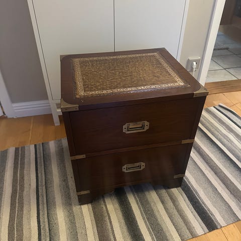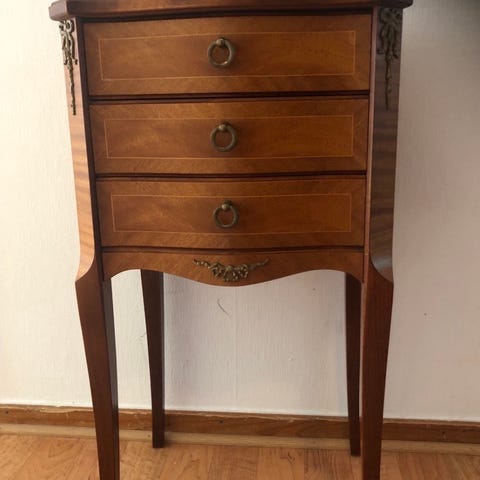 Byrån har 4 fullt fungerande lådor. Passar bra i liten hall eller som ett sängbord. 75 cm H x 35 D x 45 B.