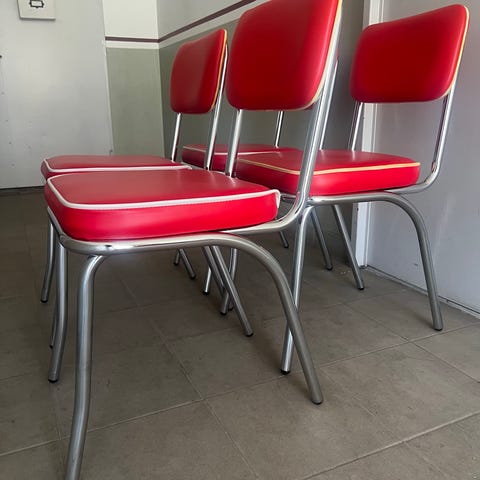 Här säljer jag ett unikt vintage set med 4 x hjärtstolar. Rött PVC/vinyl material som klarat de ca 20 åren helt fantastiskt bra. Inga skavanker! Stabil metallstomme, klapp-modell. Bra stoppning. Hämtas i Solna. OBS har mängder av annonser ute nu, bl.a byråer, tavlor och en massa vintage. Välkommen att titta runt.