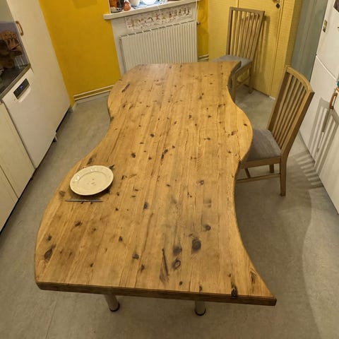 Matbord i längd 130, 180 eller 230. Gissar på björk som träslag. Kan behöva slipas och behandlas.