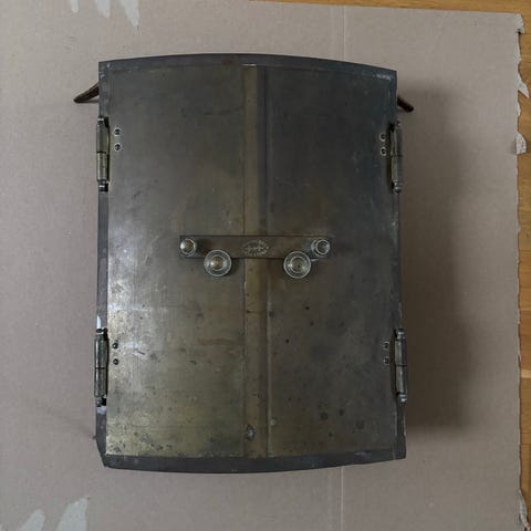 Innerdörr och ram i järn finns (se bilder). Gångjärn och beslag finns kvar.