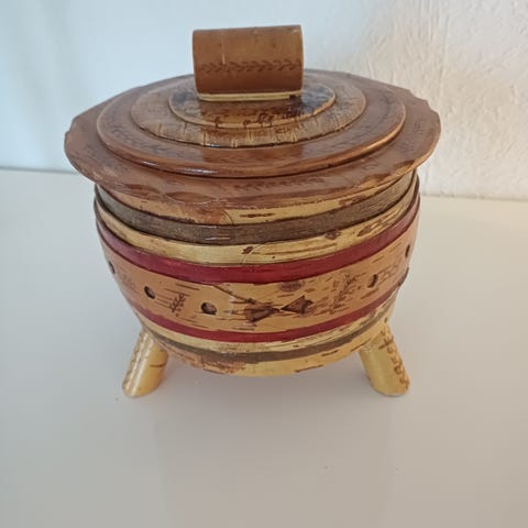 Burk i näver med handtag och lock, med tillhörande glasinsats. Rund form med dekorativa mönster runt om. Passar som förvaringsburk eller behållare för exempelvis kaffe.