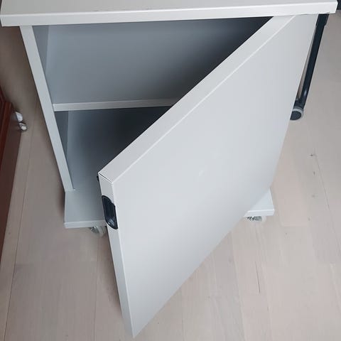Tillverkat i grå pulverlackerad metall med hinkar i plast.