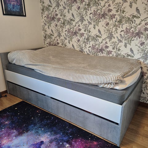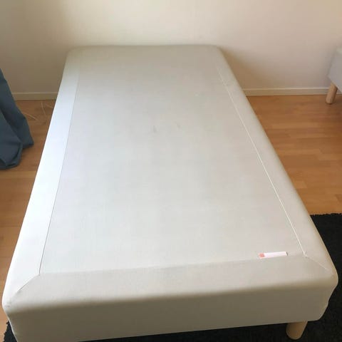 IKEA Snarum resårmadrass med bäddmadrass. Enkelresårmadrass med grått tygöverdrag och träram med ben. Vit bäddmadrass ovanpå för extra komfort. Passar som enkelsäng i sovrum, gästrum eller tonårsrum. Madrassen har fast stomme och är avsedd att användas tillsammans med sängben eller sängram enligt behov.