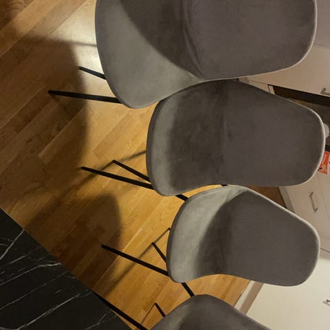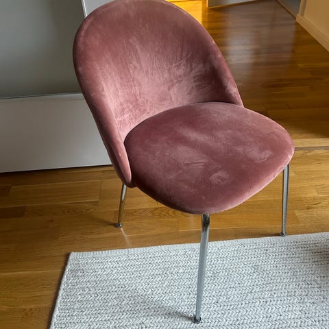 Mio stol i grön sammetsklädsel med vadderad sits och rundad rygg med dekorativa sömmar. Stolen har smala metallben i mässingsfärg.