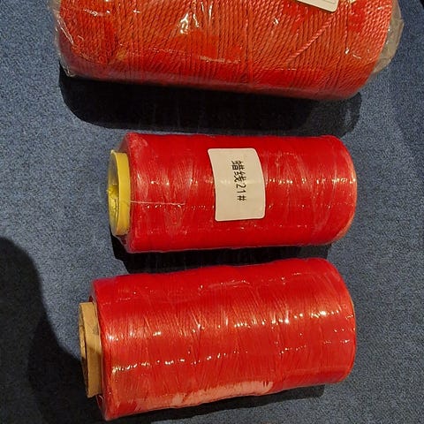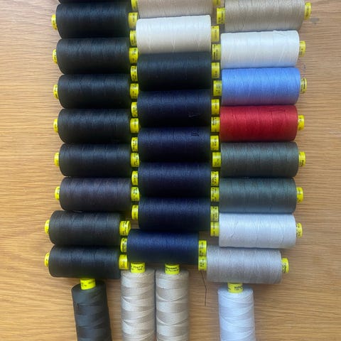 Sytråd i flera olika färger, samlad i ett större parti med många rullar. Både mindre och större rullar syns på bilderna, i nyanser som bland annat rött, grönt, gult, blått, vitt, beige och rosa.