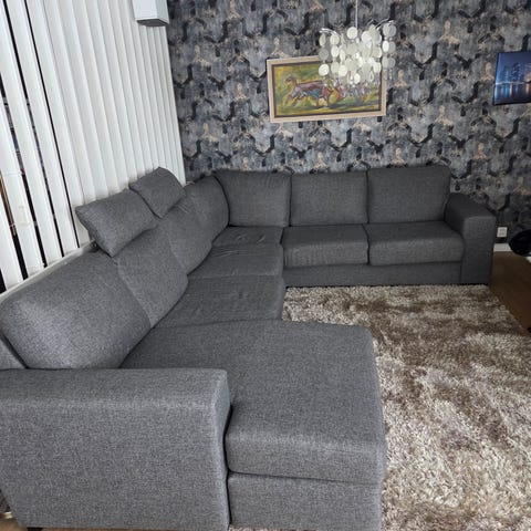 Soffan har flera sittplatser och är utformad som en rymlig hörnmodell med både divan och schäslong. Fotpall med förvaring passar i mellanrummet för att få en djupare sittdel. Lösa ryggkuddar och och sittdynor, ett brett armstöd. Klädseln är i tyg och soffan står på låga ben (ca 5 cm). Passar för vardagsrum där man vill ha en större sittgrupp.