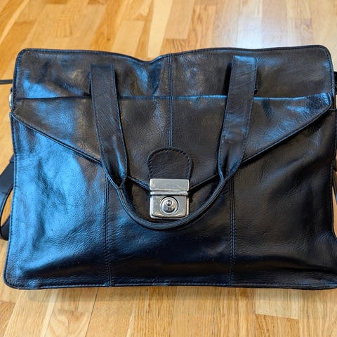 En portfölj inspirerad modell i skinn från WERA. Passar lika bra som shopping, jobb, skola eller lite större vardags väska. Den är rymlig och stilren med dubbla bärhandtag, avtagbar axelrem, två praktiska ytterfickor framtill och ett fack med dragkedja på baksidan. Den är tillverkad av fårskinn och stängs med dragkedja i toppen. Den är i mycket fint skick. Knappt använd! mått B: 43 cm H: 30 cm D: 10 cm. Framstår som oanvänd. Pris i butik 1999 kr