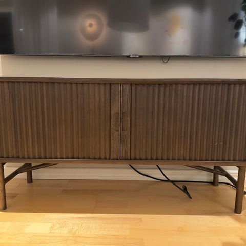 Tv-bänk i valnötsträ. Bredd 150cm. Höjd 58cm. Djup 45cm. Har ett hyllplan i och två glid dörrar framtill. Inköpt för ca 1,5 år sedan och är i mycket bra skick.