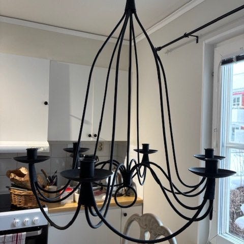 6-armad ljuskrona i svart smide för kronljus med upphängning.