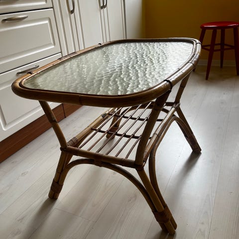 Ovalt glasbord med rotting, i fint skick. L 1,07 , B 70, H 56.