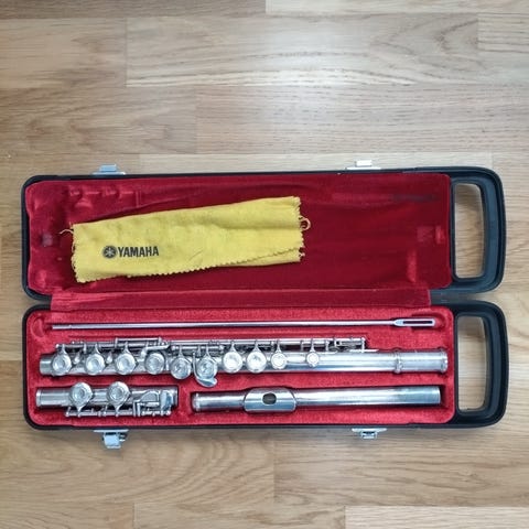 Jupiter tvärflöjt i silverfärgad metall. Flöjten levereras i hårt etui med röd vadderad insida samt separat mjukt fodral med bärrem. Instrumentet är i tre delar (huvudstycke, kropp och fotstycke) och är av standardstorlek för konsertflöjt. Passar för exempelvis musikskola, orkester eller hemmabruk.