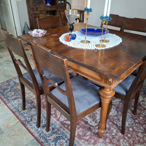 Vackert matset. Behöver slipas lite och kommer att se ut som nytt. En av stolarna har skador på lädersitsen. Du får en söt matchande underläggshållare gratis med setet.
