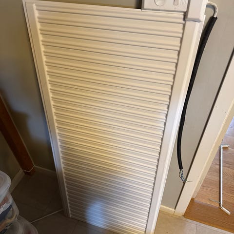 Helt nytt element - aldrig tagen ur kartongen. Gnosjö Klimatprodukter oljefylld elradiator med elektronisk termostat. Typ 1471.60, effekt 700W och spänning 400V. Mått 600x900 mm, färg: vit