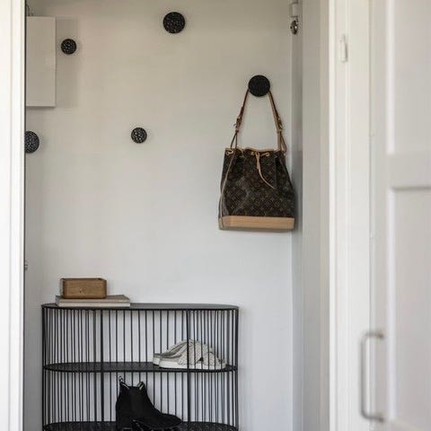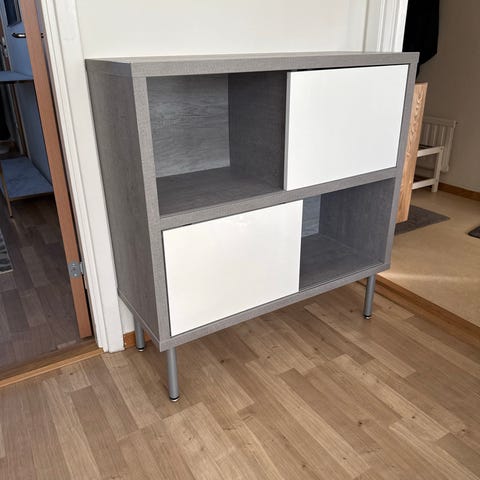 Den har snygga skjutdörrar i kontrasterande grått och vitt, samt nätta ben i ljust trä som gör den lättplacerad i både hall, vardagsrum eller sovrum.