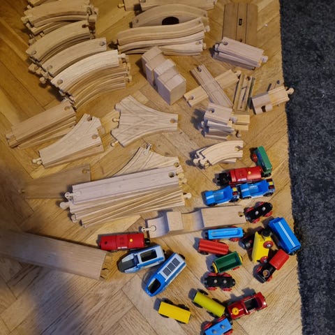 Säljer en stor BRIO-tågbana med tåg, vagnar och fordon samt figurer och olika miljö- och vägtillbehör.