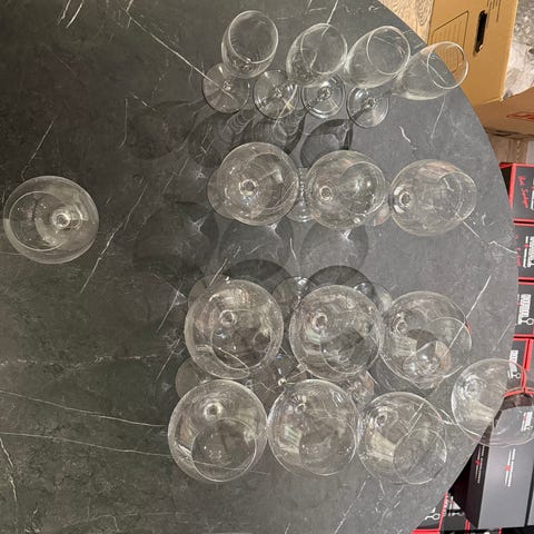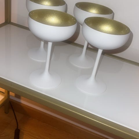 Mio glas med guldkant i räfflad modell, aldrig kommit till användning. Setet består av kupade vinglas och lägre coupeglas på fot, alla i klart glas med dekorativ guldfärgad kant upptill. Passar för servering av vin, drinkar eller dessert. Glasen har en enkel, räfflad struktur som ger ett tydligt mönster i glaset. Båda sett tillsammans kostar 998kr på Mio.