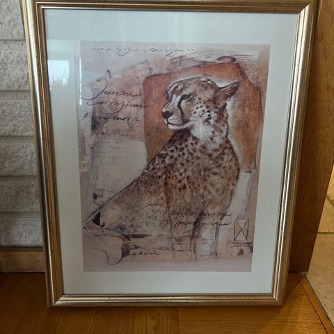Set med sex tavlor med djurmotiv föreställande rådjur, björn, älg, hare, varg och järv. Varje motiv är inramat med smal guldfärgad ram och har vit passepartout med mörk kantlinje. Tavlorna är avsedda för väggupphängning och passar i exempelvis vardagsrum, hall eller fritidshus med natur- eller vildmarkstema.