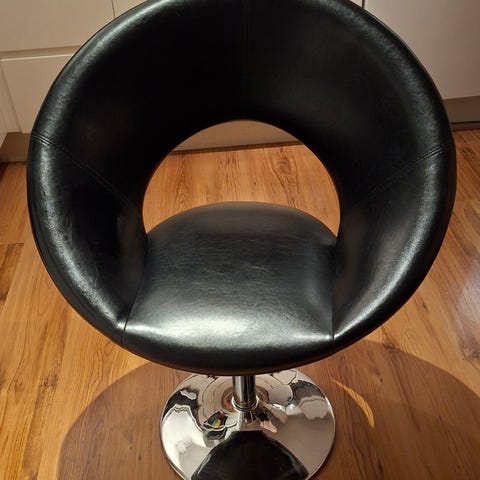Säljer en modern och stabil barstol i svart med kromad fot i mycket bra skick. Sits och ryggstöd i troligen PVU/konstläder som är lätt att torka av och hålla rent – perfekt till köksö, bardisk eller hemmabar.