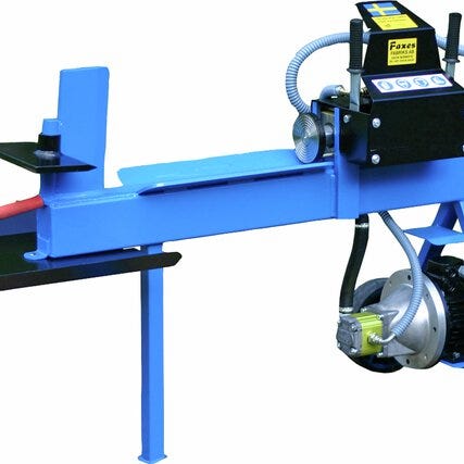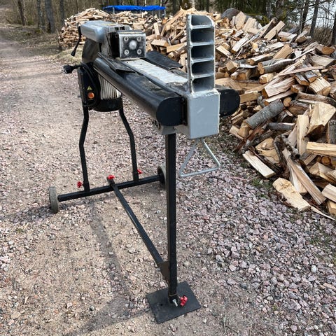 Elektrisk vedklyv i blå färg med stativ. Drivs med 230 V elmotor med effekt upp till 2,2 kW (P1) och 1,7 kW (P2). Märkström 9,6 A och frekvens 50 Hz. Motorn har kapslingsklass IP54