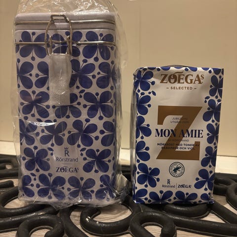 Rörstrand Mon Amie burk med blått mönster. Burken är rektangulär med lock och spänne och är avsedd för förvaring i kök, till exempel kaffe eller te. Mönstret är det klassiska Mon Amie med blå blommor på vit botten.