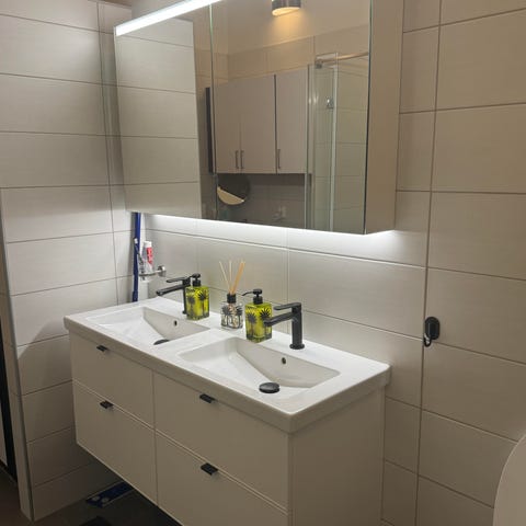 Komplett möbel med tvättställ och blandare (Tapwell) samt spegelskåp med belysning från Kvik. Mått 81x54 cm.