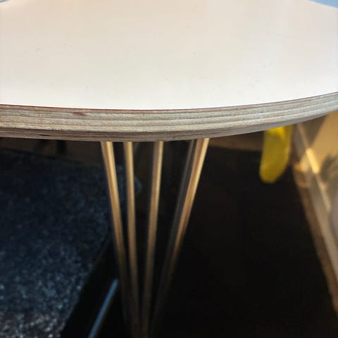 Bordet är i bra skick, förutom en liten flisa på ena kortsidan (se bilder). Stabilt och fint bord med lång livslängd kvar.