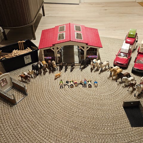 Schleich hästgård lekset. Innehåller stallbyggnader med boxar och hagar, hästfigurer, ryttare och tillbehör som hästtransport, bil, staket och utrustning för skötsel av hästar. Passar för lek med häst- och stallmiljö i mindre skala.