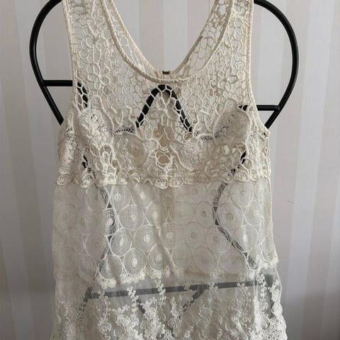 Helt oanvänd. Ovanlig modell i Rosemundes serie i silke, siden mm. Flera lager tyll/spets. Töjbar och passar S-M. Gräddvit. Jättefin till jeans eller kavaj.