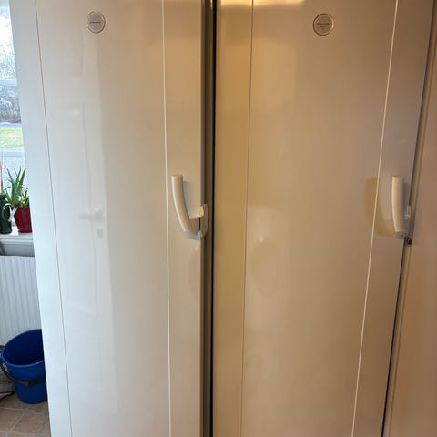 Ett LG kombiskåp, kyl och frys. Själv avfrostande. Inte använt så mycket och i leveransen blev det bucklor som syns på bilden. Den gulaktiga bilden är väldigt missvisande då den ska vara lika vit som den bilden på frysen. 1,85 högt.