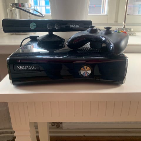 Microsoft Xbox 360 spelkonsol med tillhörande handkontroll, ratt och pedaler. På bilderna syns flera bilspel till Xbox 360, bland annat olika racing- och rallytitlar. Konsolen är i svart utförande och ratten med pedaler är i ljusgrått/silver. Utrustningen är avsedd för spel i hemmet och passar för den som vill spela bil- och racingspel med ratt och pedaler för mer realistisk körkänsla.
