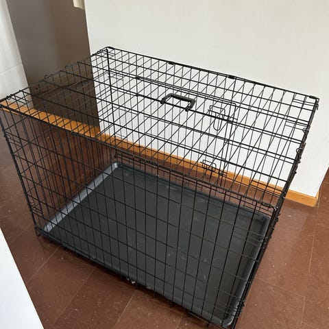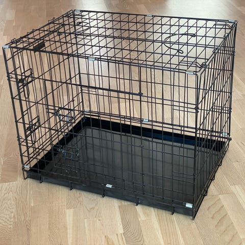 Carlson hundbur i svartlackerad metall. Buren har en gedigen gallerkonstruktion och möjlig att öppna både framifrån och från sidan. Den går enkelt att fälla ihop för transport eller förvaring. Löstagbar plastbricka i botten.