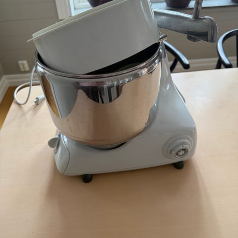 Säljer en Ankarsrum köksassistent med ett stort tillbehörs paket. Det som följer med är dubbla rostfria bunkar med ett jäslock, degrulle, degkniv, degkrok, vispbunke i plast med både den vanliga dubbelvispen och mördegsvispar, köttkvarn, korvhorn och passertillsats.