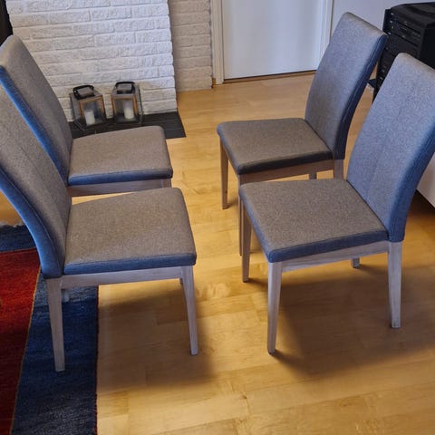 Stolar (2 st) med vita ben och ljusgrå klädsel.