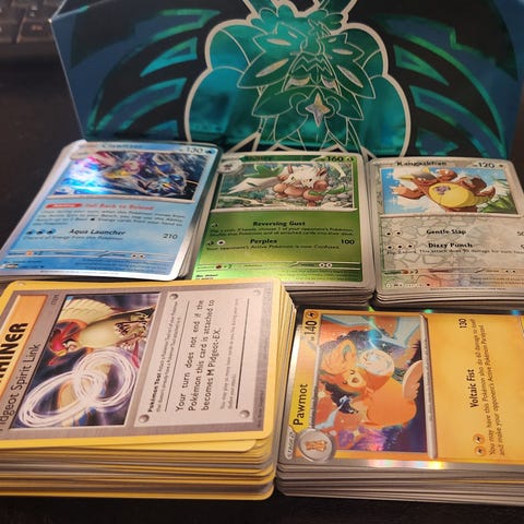 Pokémon samling spelkort med blandade korttyper och motiv från olika serier. Flera kort i högar samt lösa kort visas på bilderna, inklusive tränarkort, energikort och olika Pokémon. En plåtlåda med Pokémonmotiv ingår som förvaring. Lämplig för samling eller spel i Pokémon Trading Card Game.