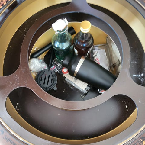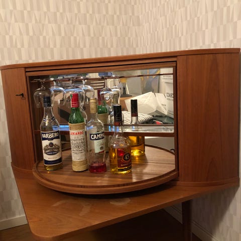 Unikt barskåp gjort helt för hand, på insidan finns spegel, hylla och belysning, innehållet på bild följer ej med, tillverkarens namn och årtal står på insidan dörrarna, väl bevarat