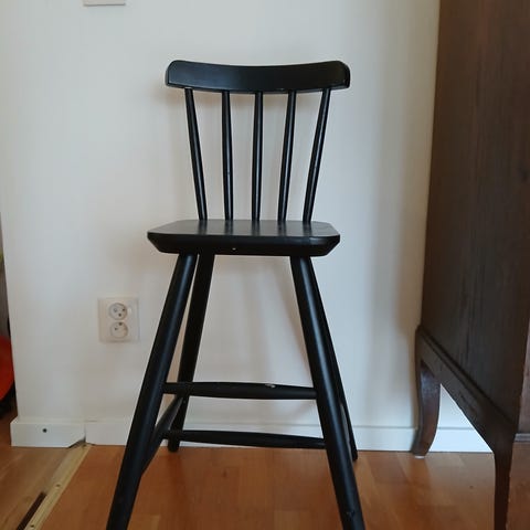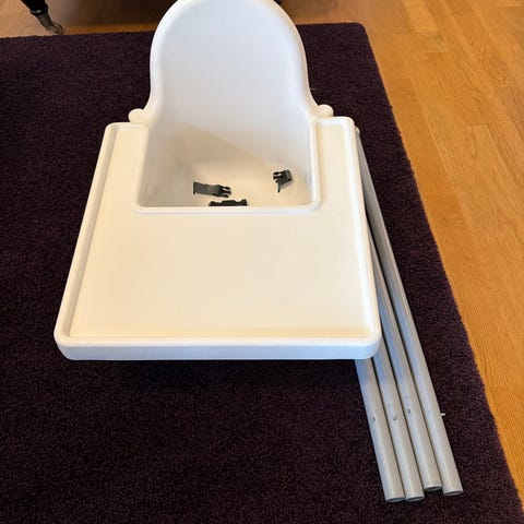 Ikea barnstol i plast med högt ryggstöd och säkerhetsrem. Sitsen är vit och benen är i metall. Passar för små barn vid matbord eller annan sittplats där extra stöd och höjd behövs.