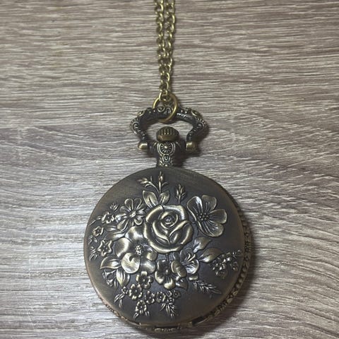 Superfint fickur av kvartstyp med kedja, tillverkat i en mörk metallfinish och dekorerat med kugghjulsmotiv.