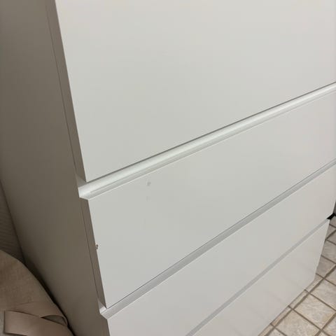 Vit malm byrå med fyra lådor. Repa på toppen och tillslagen på ena sidan under. Se bilder. Fullt användbar.