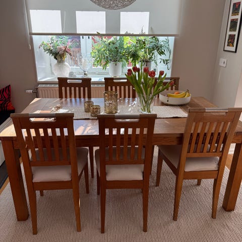 Sex stolar samt matbord i Ek, väldigt fint skick.