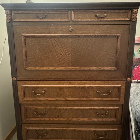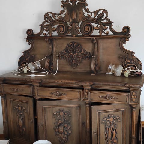 Antikt skåp i brun träfinish. Sammetsbakgrund.