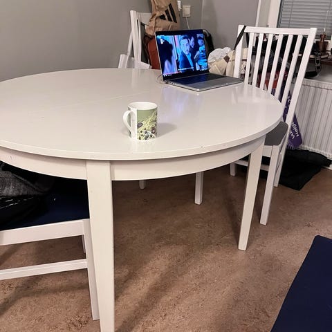 Runt matbord med 4 stolar iläggsskiva i bordet. 110 cm i diameter med skiva i 155 cm långt. Höjd 74 cm. 1500:-