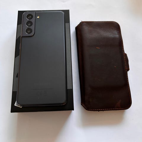 Samsung Galaxy S25 mobiltelefon med 128 GB internminne. Trippelkamera med blixt på baksidan. Levereras med laddare, originalförpackning, plånboksfodral och dokumentation enligt bild.