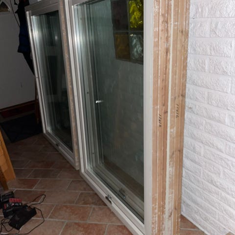 Flera lösa fönsterbågar med glas, målade i ljus färg. Passar exempelvis för renovering, utbyte av äldre fönster eller byggprojekt där begagnade fönster kan användas.