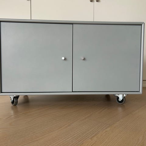 String skåp med skjutdörrar i grå metall, formgivet av Nils Strinning. Skåpet har två skjutdörrar med runda handtagsöppningar på framsidan och är avsett att monteras i en String-hylla eller användas som förvaringsmodul. Passar för förvaring av böcker, porslin eller andra mindre föremål i vardagsrum, hall eller arbetsrum. Färgen är neutral grå och ytan är slät med vissa mindre bruksspår enligt bild.