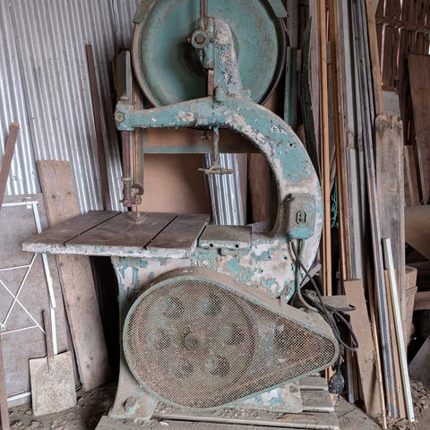 Äldre, stabil men hemmagjord bandsåg. Fullt fungerande såg med belysning och stående på låsbara hjul för enkel förflyttning och transport.